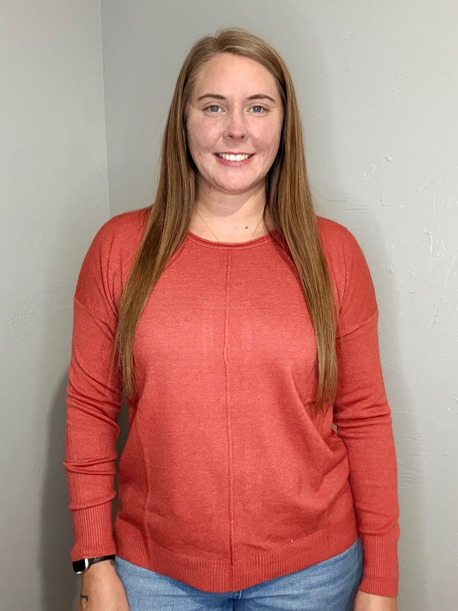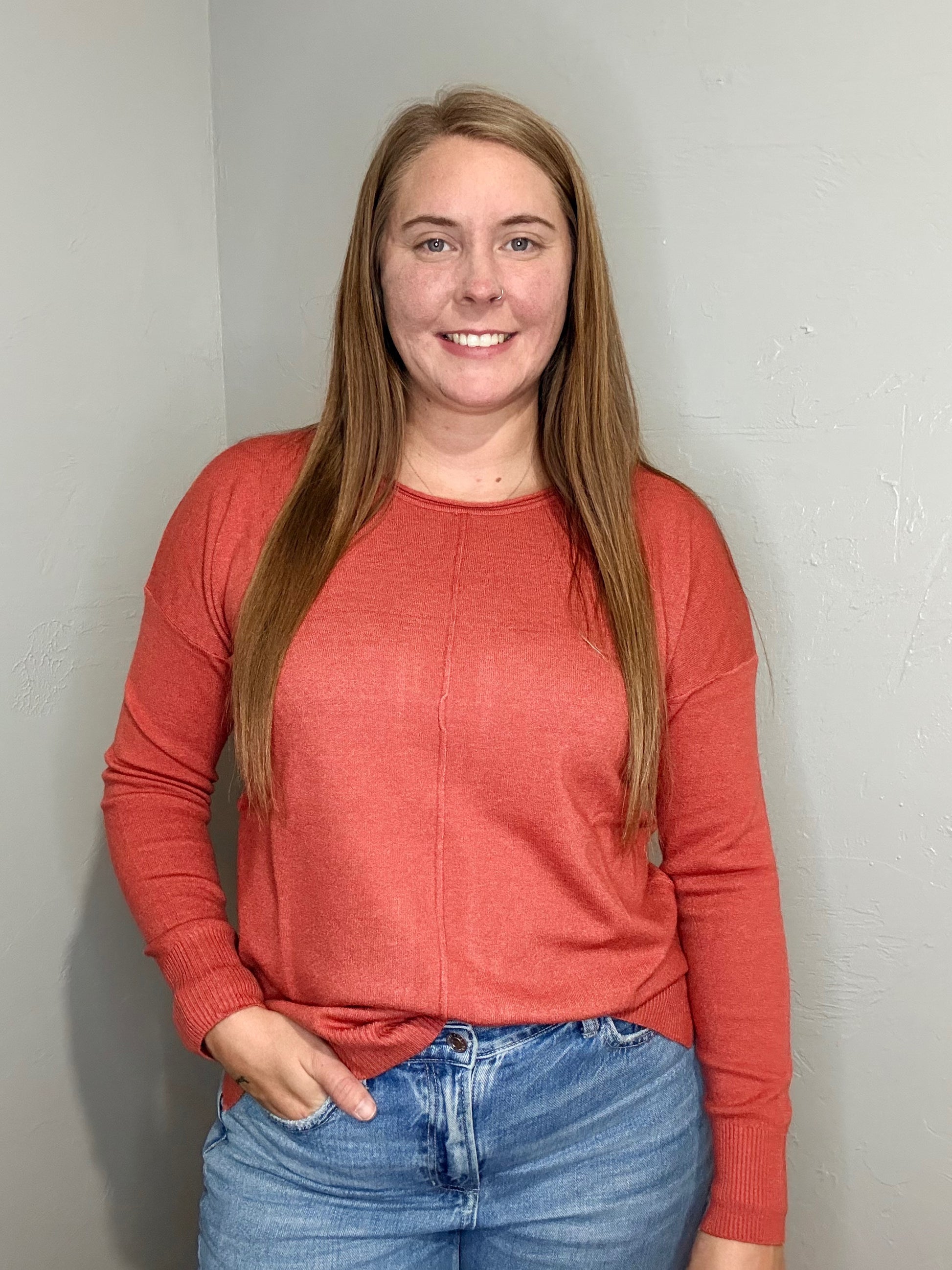 Lightweight sweater and very soft! I'm in a small in the pictures. It runs a little oversized, I feel like you can either size down one or stay true to size for more of a relaxed fit.